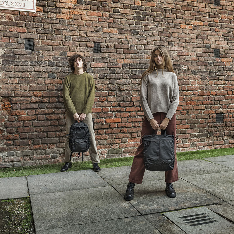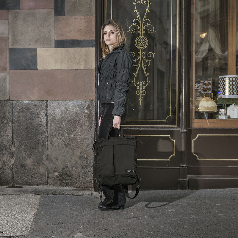 Thiết kế với các khối màu hình học cùng chất liệu vải có kết cấu nhẹ thể hiện vẻ đẹp của những đường nét tối giản. Thiết kế đa năng có thể cầm trên tay, đeo sau lưng hay gắn vào vali du lịch.