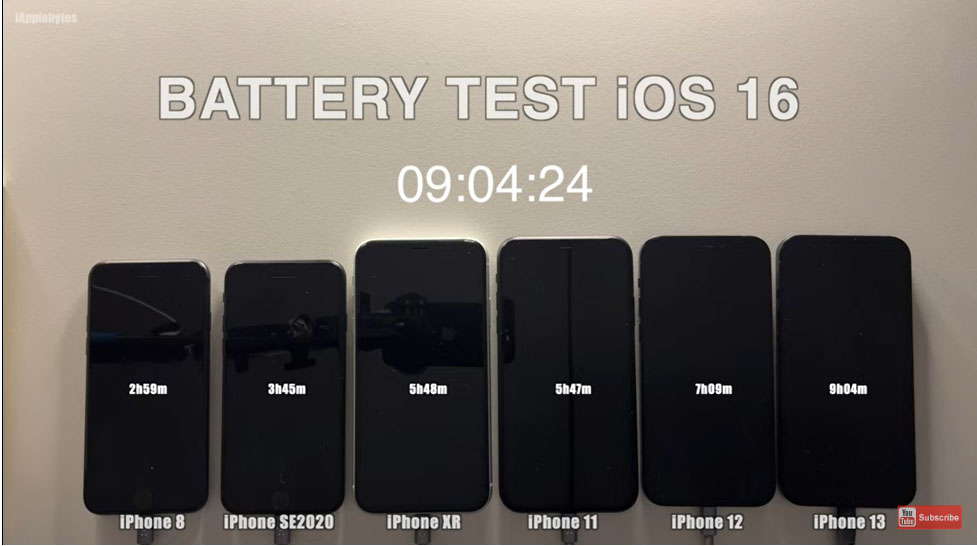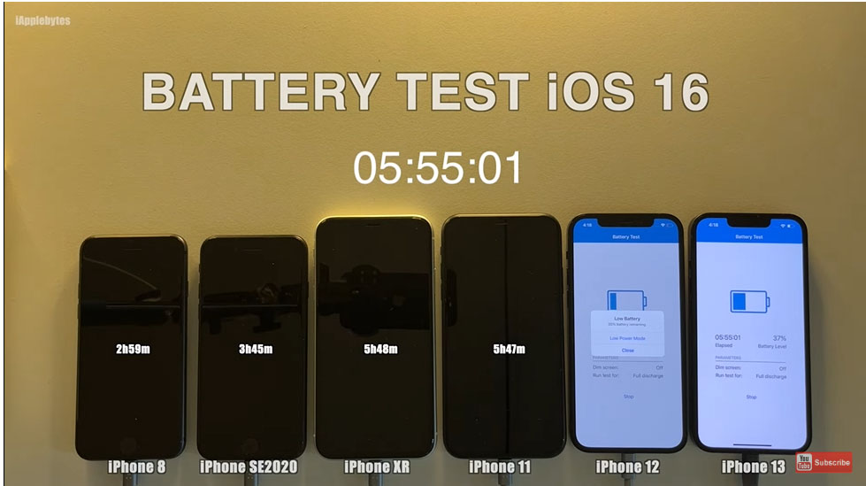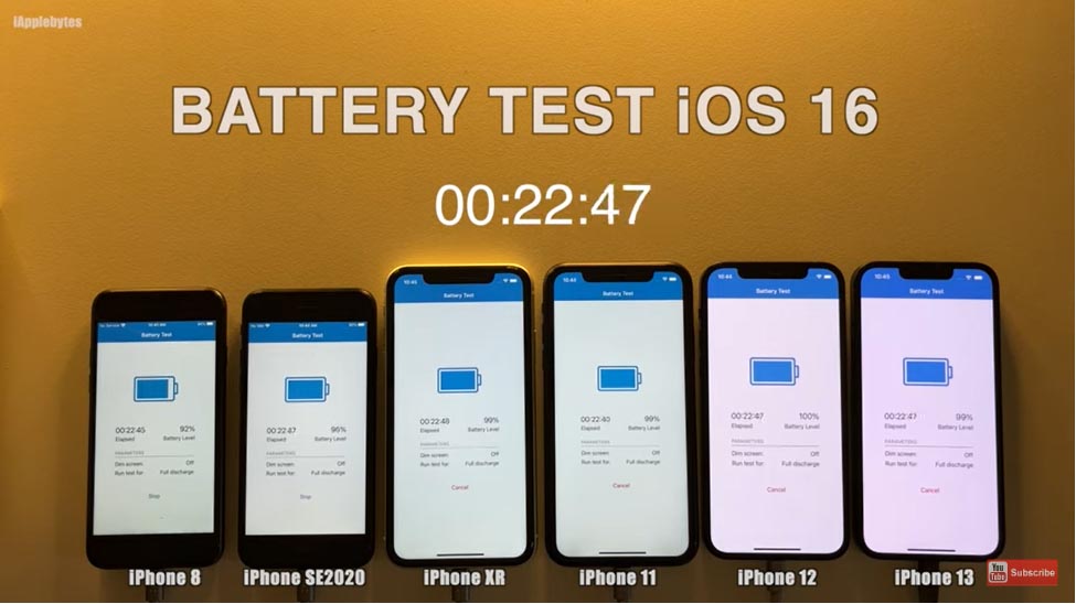 Theo cuộc thử nghiệm của iAppleBytes, các dòng máy từ iPhone 8, iPhone SE 2022, iPhone XR, iPhone 11, iPhone 12 và iPhone 13 đang chạy phiên bản iOS mới nhất, tức là iOS 16. YouTuber đã sử dụng phần mềm Geekbench để kiểm tra thời lượng pin của các điện thoại này. Tất cả iPhone đều được sạc đến 100% và sau đó đặt để chạy ở độ sáng màn hình 25%. Các điện thoại cũng được kết nối với cùng một mạng Wi-Fi.