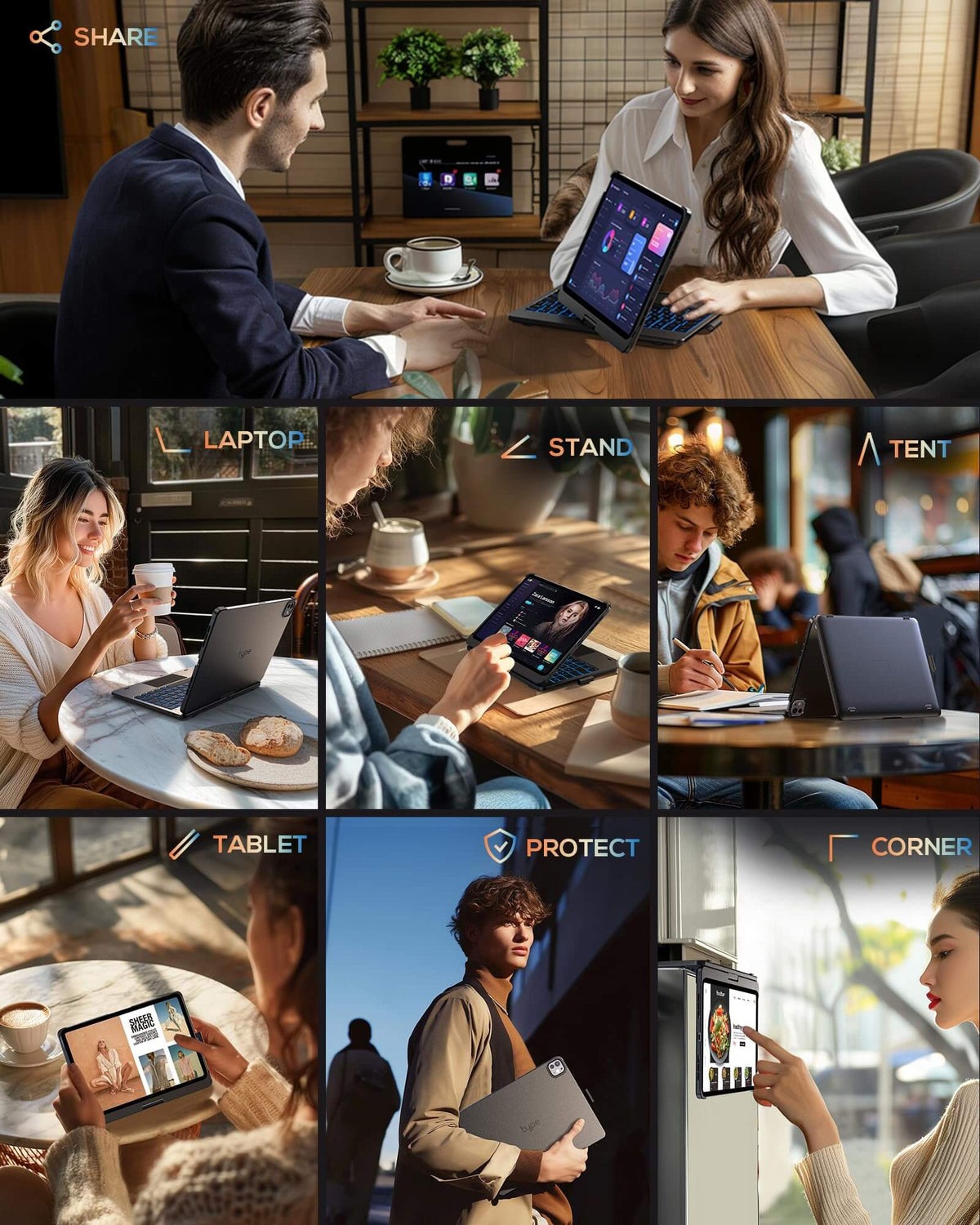 Bản lề xoay 360° hai trục (đã kiểm tra 20.000 lần gập) cho phép iPad hoạt động ở 7 chế độ khác nhau, thuận tiện trình chiếu, soạn thảo hay giải trí.