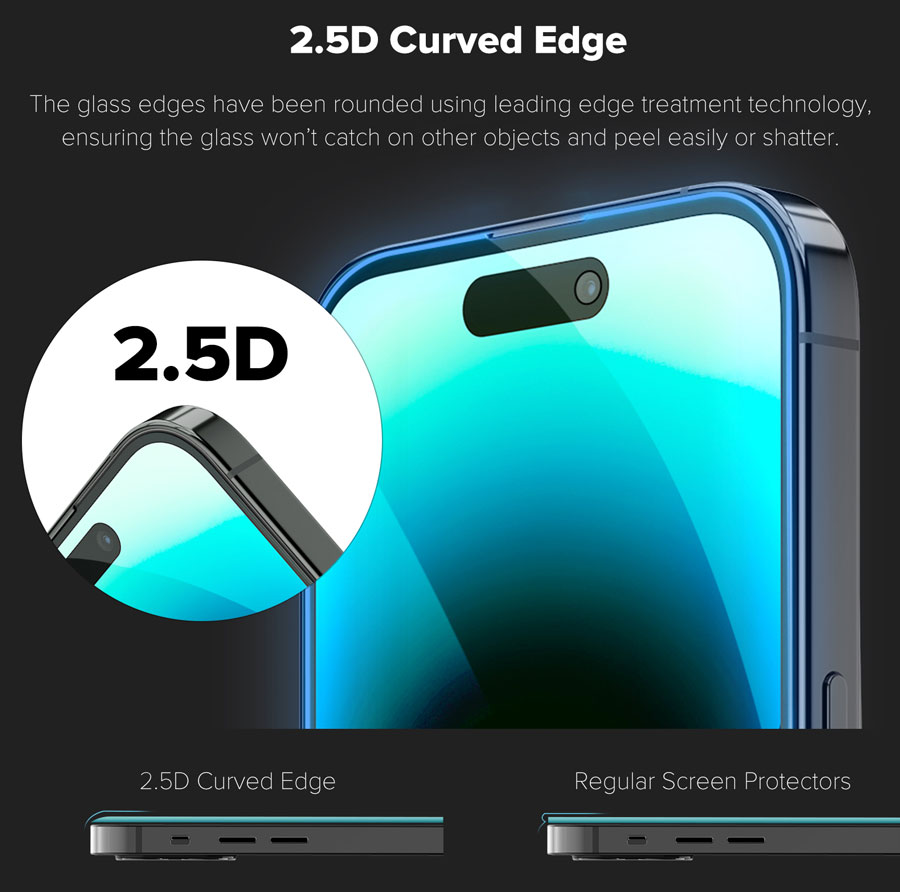 Các cạnh cong của kính được thiết kế bo tròn bằng cách sử dụng công nghệ xử lý cạnh hàng đầu, đảm bảo kính sẽ được ốp vừa vặn vào bề mặt iPhone để kính không bị bám vào các vật khác, dẫn đến bong tróc kính hoặc vỡ kính.