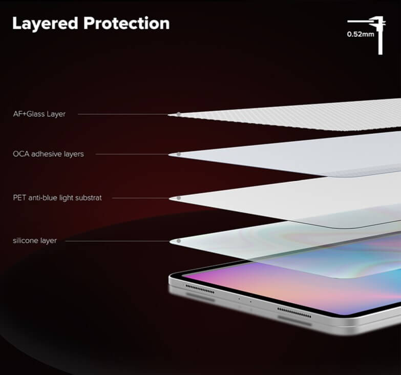 Cường lực Chống Ánh Sáng Xanh iPad JCPAL có cấu tạo gồm 04 lớp, gồm: Chống dấu vân tay, chống chói, lớp cường lực, keo dính trong và silicon. Chúng có khả năng chống chói và chống dấu vân tay vô cùng hiệu quả.