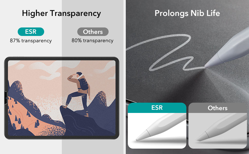 Với dán màn hình ESR Paper Feel iPad, bạn sẽ không còn lo lắng nhờ độ trong suốt đạt, đảm bảo 87% độ phân giải & hiển thị chính xác màu sắc, dù là môi trường chói sáng như ngoài trời. Và cũng không gây cản trở cho camera trước.