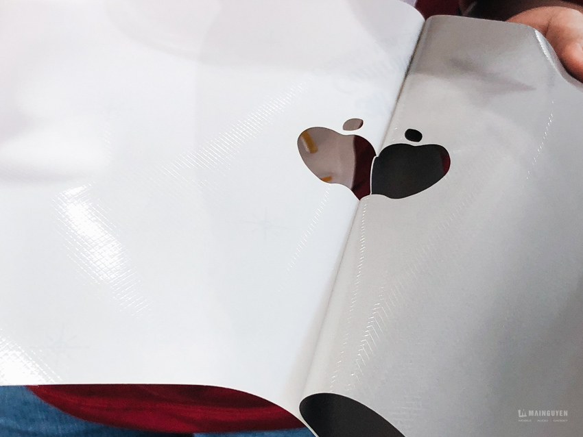 Mặt trên dễ dán hơn, chỉ cần canh đúng sát lề là được. Logo táo đã được cắt sẵn, bạn chỉ cần canh đúng.